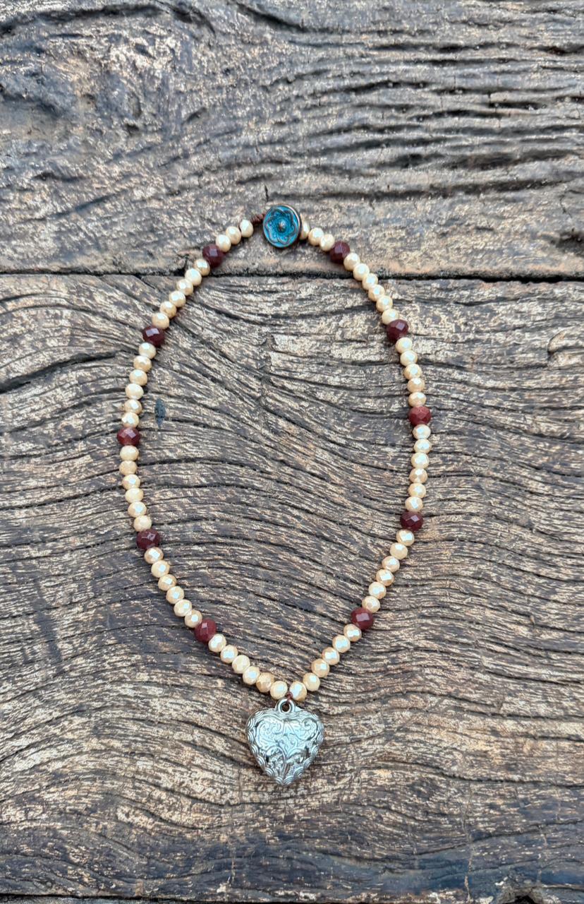 Colar feito de contas pequenas e brilhantes, na cor bege e vermelho escuro, intercaladas ao longo da peça. Ele possui um fecho azul metálico com…