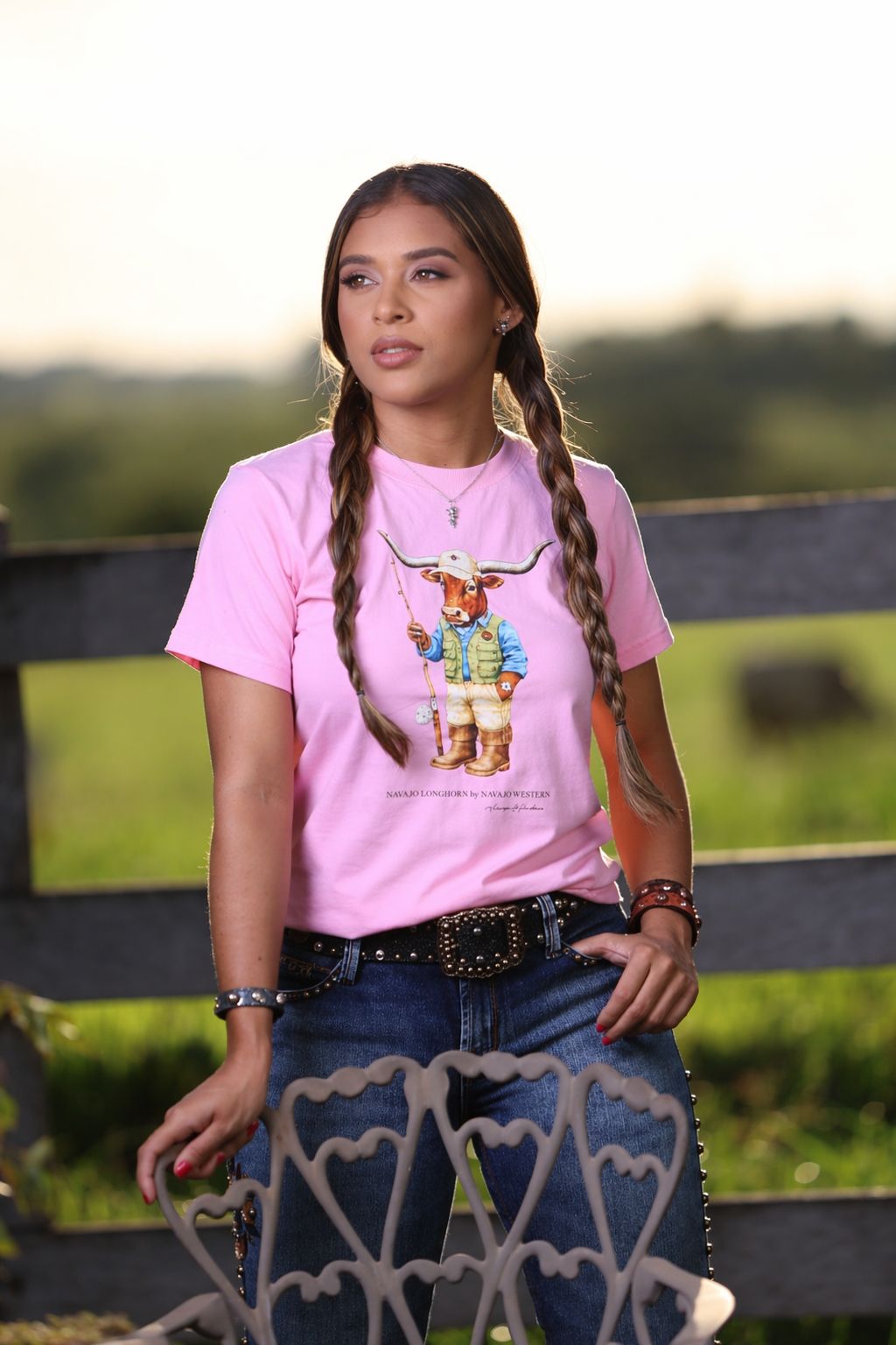 Camiseta rosa com estampa divertida de Longhorn pescador.